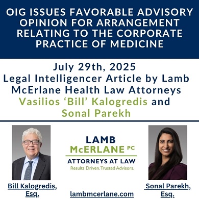 July 29, 2025 Legal Intelligencer article by Lamb McErlane health law attorneys Vasilios J. Kalogredis, Esq. and Sonal Parekh, Esq.