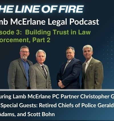 Tune in to Lamb McErlane’s latest legal podcast, In the Line of Fire – Episode 3, Building Trust in Law Enforcement – Through the Development & Implementation of Policy & Training -Part 2. The podcast is hosted by Lamb McErlane Partner Christopher Gerber, Esq., with guests, PA Chiefs Association Executive Director, Scott Bohn, and former Police Chiefs Jerry Simpson and Jim Adams.