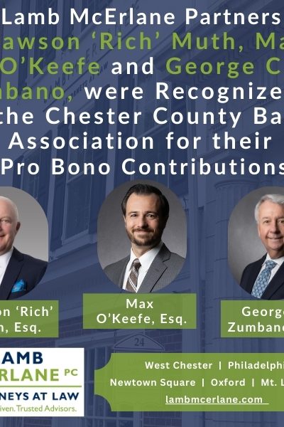 Lamb McErlane Partners Dawson R. Muth, Max O’Keefe and George C. Zumbano Recognized by the Chester County Bar Association (CCBA) for their Pro Bono Contributions