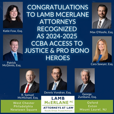 Congratulations to Lamb McErlane attorneys Katie Fow, Patrick McGinnis, R. Samuel McMichael, Max O’Keefe, Cara Sawyer, Dennis Vondran, and George Zumbano on being named 2024-2025 Access to Justice & Pro Bono Heroes by the Chester County Bar Association. (CCBA)